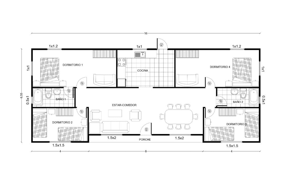 La casa cuenta con cuatro dormitorios, dos ubicados en el ala izquierda y dos en el ala derecha del proyecto, lo que permite una organización simétrica ideal para familias.